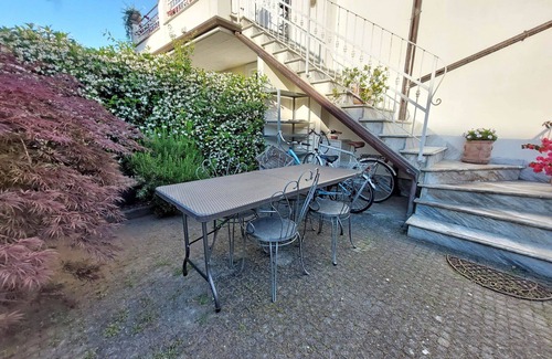 El apartamento está ubicado en el primer piso y tiene en la planta baja un pequeño jardín y un área de lavandería con lavadora y ducha de agua caliente.
