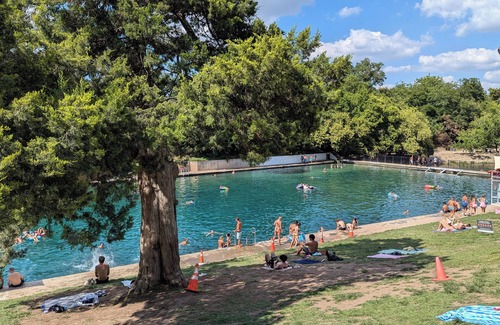 Brevemente, Zilker Park es de 358 acres de un hermoso parque del centro de la ciudad y dentro de él se encuentra la piscina Barton Springs, que se describe con cariño como las joyas de la corona de Austin. Temperatura promedio de 68-70 grados, ideal para nadar todo el año. Es NADA tímido de espectacular.