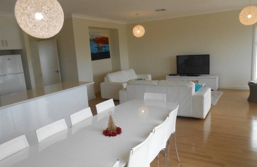 La cocina de arriba, la sala de estar y el balcón ofrecen impresionantes vistas al mar hacia Chiton Rocks y Port Elliot.
