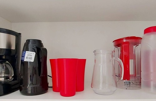 - Kitchen with LED lighting on the countertop, duplex refrigerator, microwave, cooktop with 2 burners, water filter, electric coffee maker, thermos, pans, cutlery, glasses, cups, basic items and kitchen accessories