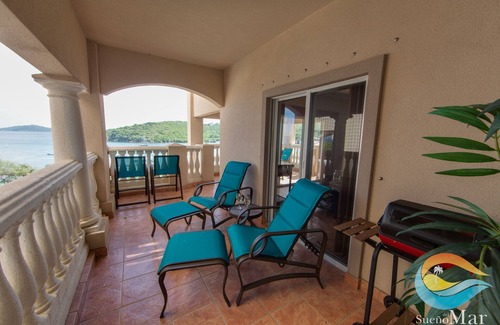 La zona de estar al aire libre de gran tamaño es una envoltura alrededor de balcón con acceso desde el salón y el acceso también privado desde el dormitorio principal. Hay una mesa de altura balcón con seis sillas para ver el atardecer sobre el puerto y más allá de las islas circundantes. El lado dormitorio principal del balcón tiene dos sillas de la sala con la otomana y la mesa - perfecto para café de la mañana o por la noche cócteles mientras escucha las olas romper en la orilla.