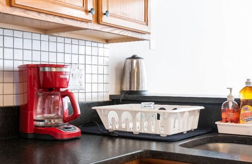 Hay una pequeña sala de lavandería con lavadora y secadora al lado de la cocina.