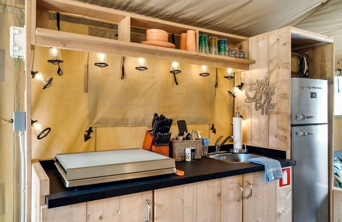 Este camping cuenta con 2 dormitorios y dispone de wifi gratis y balcón. La cocina está equipada con frigorífico, placa de cocina y microondas.