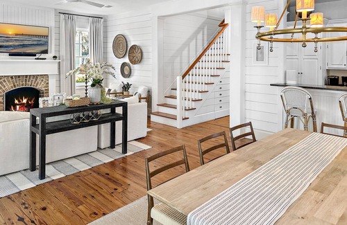La casa fue redecorada en 2019 con nuevos muebles, colchones y ropa de cama, alfombras y cortinas personalizadas. La casa se siente tranquila y refrescante con su paleta de colores neutros, paredes y molduras recién pintadas, lámparas de diseño actualizadas, obras de arte originales. La gran y luminosa sala está terminada con hermosos pisos de madera, alfombras nuevas y un plano de planta abierto para permitir que su familia e invitados participen en actividades grupales, jueguen o vean una película. Una chimenea de gas hace que la sala de estar sea acogedora y el nuevo sofá seccional garantiza que haya suficiente sala de estar para todos en su grupo. La cocina totalmente equipada está equipada con electrodomésticos vikingos y muchos utensilios de cocina, platos, suministros y artículos para el hogar para que disfrute de su estadía. ¡Con un área de alimentación para perros dedicada (3 tazones para elegir) sus cachorros también pueden disfrutar de sus vacaciones! El acogedor porche delantero es perfecto para un brunch al aire libre o una hora feliz por la noche. Hay un porche con mosquitero en la parte posterior con una mesa de comedor con capacidad para 6 invitados y una acogedora sala de estar para un