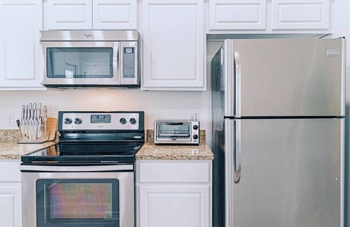 DINING/KITCHEN: The kitchen is fully equipped with everything you need to make a meal: electric cooktop/oven, stainless steel fridge, keurig coffee maker AND regular coffee maker, blender, and 4-slice toaster oven. Oil/pepper/salt, pots/pans, utensils, dishware, and tupperware are also provided. The dining table comfortably seats at least 8 people.