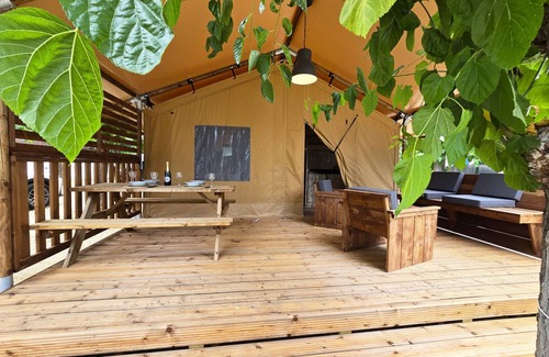 Charming glamping-style tent located inside Costa Dorada Camping, in Canet de Mar, an ideal natural environment to disconnect and enjoy the beaches of Maresme. The campsite is just steps away from the sea and surrounded by Mediterranean vegetation, perfect for peaceful holidays with family or friends. It is located within the urban area of Canet de Mar, near bars, restaurants and with easy access to public transport. The municipality also has a local train station and the Museum of architect Lluís Domènech i Montaner.Inside, the tent has a dining area with a kitchen equipped with a refrigerator with freezer, ceramic hob, toaster, Dolce Gusto coffee machine, as well as cutlery, utensils and kitchen crockery. It also has a table designed to enjoy long meals in good company.It is distributed in two bedrooms: one with a double bed (160x200 cm) and another with bunk beds with two single beds (80x200 cm), ideal for ensuring comfort for both families and groups of friends.The bathroom includes a shower cabin and WC. Additionally, the accommodation has air conditioning that maintains a pleasant temperature throughout the space during the hottest days.Outside, you will find a spacious terrace equipped with a table for four people, a spacious bench ideal for relaxing at sunset and a portable barbecue to enjoy outdoor meals.Pets are not allowed.Entry: from 4:00 pm to 8:00 pm. Exit: Before 10 am. In the case of late check-in, it is necessary to contact the agency in advance.Key collection: at the campsite reception.Before arrival, the online contract must be signed, pending payments must be made, and a deposit of €300 must be made as a guarantee, which will be made by card. This deposit will be returned within 7 days after departure, once the accommodation status has been verified.Mandatory services included in the price: Final cleaning, bed linen, tourist tax €1/person/night (for those over 16 years old).Optional services not included in the price: extra bed linen, towels, late check-in. You can contract these when making the reservation.