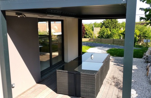 Calefacción geotérmica, cocina equipada, despensa, sala de estar con TV de pantalla plana, gran ventanal que da a una terraza con pérgola eléctrica, WC separado