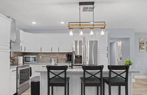 Experience pure luxury in this stunning home, perfectly situated in an ideal location. With beautiful marble countertops and stainless steel appliances, this dreamlike setting will leave you in awe. The fully fenced backyard features a lavish barbecue grill, smart TVs, and board games for your entertainment. Discover your own paradise in this opulent abode, just minutes away from i4, Wekiwa Springs State Park, Disney, and Downtown Orlando. Live like royalty and book this exquisite sanctuary.