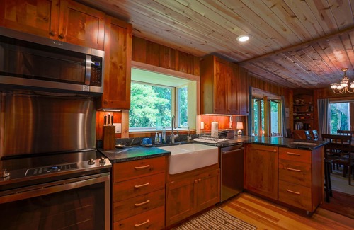 Una cocina totalmente equipada con estufa, horno, microondas, máquina de hacer gofres y cafetera se conecta a un hermoso comedor con capacidad para 12 para acomodar a la multitud. Usted puede encontrarse tomando el desayuno o el almuerzo en el porche grande junto con su mesa de picnic o simplemente relajarse y disfrutar de la vista desde las sillas de Adirondack o la hamaca cerca.