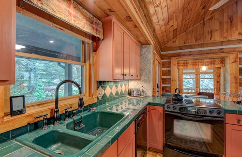 Ingrese al nivel principal de la casa con solo unos pasos del área de estacionamiento pavimentada. La gran sala de la cabina cuenta con cómodos muebles dispuestos alrededor de una chimenea de gas de piedra y un Smart HDTV con programación DirectTV Now en un dispositivo Roku. El rincón del comedor está a un lado, con una mesa extensible y cuatro sillas. La cocina está diseñada de manera eficiente y tiene un hermoso mostrador de azulejos y placa para salpicaduras, junto con un refrigerador doble y una estufa eléctrica de vidrio.