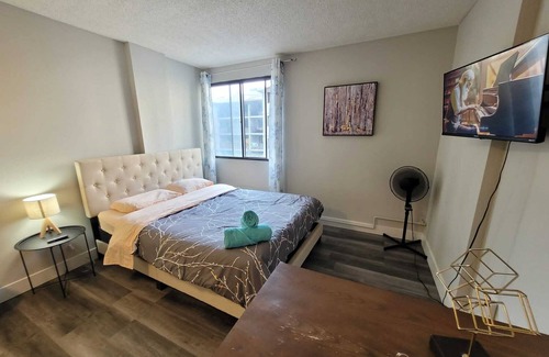Este apartamento de 1 dormitorio y 1 baño se encuentra en Calgary y es una ubicación fantástica desde la que recorrer los alrededores. A los amantes de la naturaleza y el aire libre les encantará estar a 8min a pie de Prince's Island Park y a 4min de Bow River. Estarás a solo 5min a pie de Puente de la Paz y a 10min a pie de Centro comercial de Eau Claire Market. Descubre otras zonas y adéntrate más en Calgary: estarás a 6min a pie de la Estación de tren ligero 8th Street SW y a 6min de la Estación de tren ligero 7th Street SW, de modo que coger el metro te resultará muy sencillo.