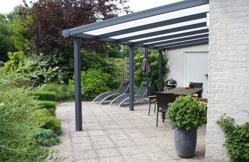 La terraza al jardín está cubierta (3m x 6m) y por lo tanto también permite