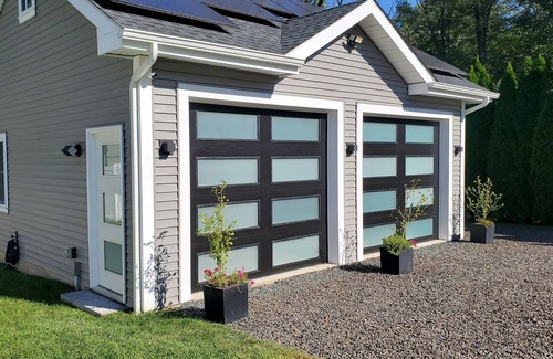 This recently finished rustic studio with modern touches is decked out with heated floors in the brand new bathroom, a queen size murphy bed with a plush memory foam mattress, kitchenette with full size refrigerator and blackstone griddle. The full-glass overhead doors fill the studio with natural light, and the space can be darkened easily at the touch of a button.