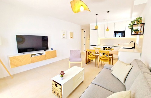 El salón, amplio y luminoso, cuenta con un cómodo sofá chaise long, perfecto para relajarte mientras disfrutas de tu serie o película favorita en la smart TV. Además, el apartamento ofrece WiFi gratuito para que te mantengas conectado durante tu estancia. Los grandes ventanales no solo llenan el espacio de luz natural, sino que también ofrecen acceso directo a la terraza, donde podrás disfrutar del aire libre y del sol en su mobiliario exterior. Anexo al salón, encontrarás una moderna cocina americana equipada con todo lo necesario para tus comidas: horno, microondas, lavadora y un menaje completo que te permitirá sentirte como en casa. El apartamento dispone de 2 dormitorios confortables y 1 baño con ducha, diseñado para ofrecerte la máxima funcionalidad y estilo.