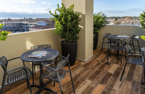 Terraza solarium equipada con reposeras, ducha y tollas.