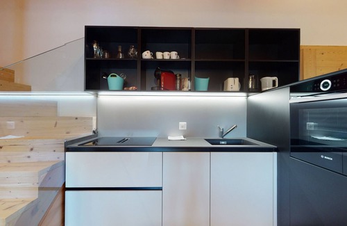 A cosy and idyllic new 4* duplex flat, 75 m2 for 6 people with 2 bedrooms. Sunny summer living room with TV, WiFi and two single sofa beds. Open kitchen fully equipped with Delta coffee machine, fridge, freezer, dishwasher, oven, microwave, kettle, toaster, fondue pot and juicer.