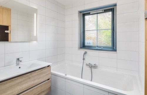 On the first floor there are two bedrooms and one bathroom. The bedrooms each have two single beds. The bathroom has a bathtub, rain shower and a washbasin. There is also a separate toilet. The bungalow also has a washing machine and dryer.