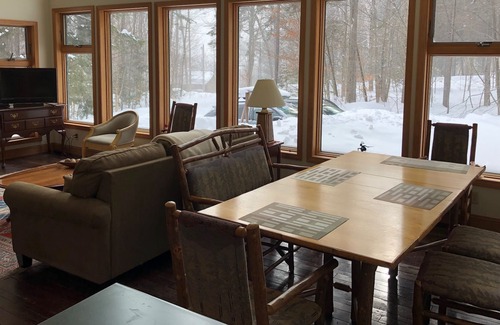 Rodeado de pinos y abedules, las numerosas ventanas, incluida una sala de estar con más de dos pisos de altura, ofrecen vistas pintorescas de madera. Esta es una casa de vacaciones en un lugar deportivo.