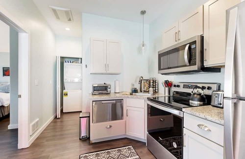 Prepara una comida casera en la cocina, equipada con horno, placa de cocina y frigorífico, además de cafetera y tetera, microondas y utensilios de cocina. Disfruta de la conexión a Internet y de la televisión. Podrás viajar con poco equipaje, porque tendrás una lavadora y una secadora a tu disposición. Otras comodidades de este alojamiento de 1 dormitorio y 1 baño incluyen un sofá cama y ropa de cama.