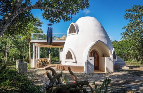 Domo de arquitectura orgánica. Privado e inmerso en la selva Maya, dentro de una huerta agoecológica de Yaca, entregándote una sensación de conexión, libertad y tranquilidad.