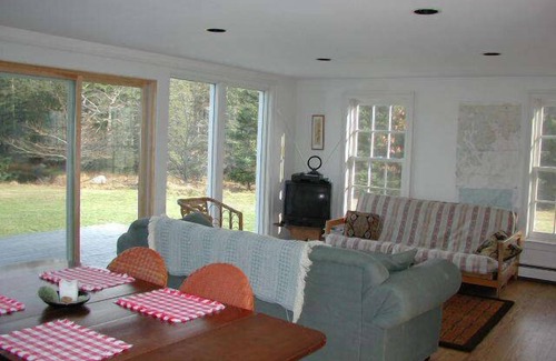 Dorsey Cottage está situado en una cala tranquila que está justo al lado de los populares senderos de navegación de Eggemoggin Reach (un cuerpo de agua de una milla de ancho que separa Deer Isle del continente). Esta pintoresca ensenada se extiende alrededor de dos lados de la casa y proporciona vistas más ampliadas hacia el noreste, mirando a través de la ensenada y al alcance. La casa está alejada de Reach Road, con una gran pradera frente a la casa, proporcionando un entorno totalmente tranquilo. Simplemente amueblado, el interior proporciona un ambiente un tanto modesto y relajado. La cocina, la sala y el comedor son abiertos, amplios y luminosos, y todos contemplan la belleza natural circundante. La casa tiene dos dormitorios, uno abajo (reina) y uno arriba (doble), cada uno con su propio baño. También hay un futón plegable en la sala de estar para dormir más. Una cubierta abierta corre a lo largo de toda la parte posterior de la casa e incluye muebles de patio. Tanto la sala de estar como el dormitorio de la planta baja tienen puertas corredizas de vidrio que conducen a la terraza. Hay una cubierta cubierta en la parte delantera de la casa con vistas al pasto. El entorno es un paraíso para los niños para la exploración, pero también un telón de fondo sereno para que los adultos se relajen y se relajen. Lavadora, secadora, TV tendrá una conexión por cable o satélite, VCR, DVD.