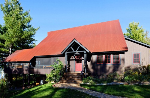 Nuestra casa está ubicada en más de 900 pies de playa privada (18 acres) rodeada de hermosos bosques de pino blanco, arce y abedul. La casa de 3000 pies cuadrados fue construida en 2003 a partir de un granero de heno Vermont de 200 años de antigüedad que habíamos desmontado, transportado y cuidadosamente ensamblado en una casa de vacaciones de lujo. Las vigas talladas a mano en el interior tienen un diámetro de hasta 20 'y las paredes son de granero original.