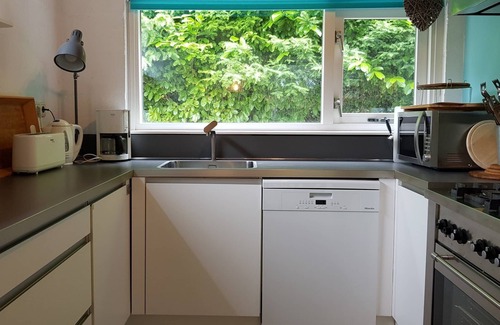 Prepara una comida casera en la cocina, equipada con horno, frigorífico y lavavajillas, además de cafetera y tetera y microondas. Podrás viajar con poco equipaje, porque tendrás una lavadora y una secadora a tu disposición. Otras comodidades incluyen una chimenea, ropa de cama, calefacción y servicio de limpieza limitado.