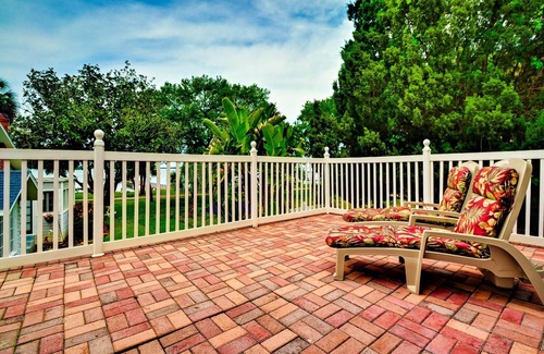 Esta unidad de estilo de cochera ofrece una vista panorámica de St. Joseph & # 8217; s Sound y la isla Caladesi de un segundo piso, 350 pies cuadrados de terraza de ladrillo. Genial para el desayuno de la mañana, una barbacoa o para tomar el sol.