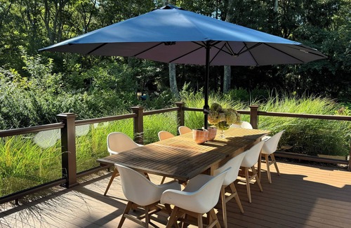 Cuando entras, se encontrará en una casa bañada por el sol con las ventanas y puertas correderas que crean una transición sin problemas al aire libre. Recientemente decorado y pintado casa limpia y bien iluminada en East Hampton en 2 acres. A sólo 5 minutos de la ciudad de East Hampton y playas, a 10 minutos a Sag Harbor. Plan de piso abierto, techos abovedados, gran terraza. En la planta baja, se encuentran dos dormitorios - uno con dos camas que se abre a la terraza y piscina, y tiene su propio cuarto de baño de nueva construcción con acceso al exterior. La otra habitación tiene una cama de matrimonio y un baño completo de nueva construcción separada. La cocina del Chef ha sido renovado recientemente con la parte superior de la línea blanca. Una sala de estar y comedor grande, con techos abovedados y chimenea de pizarra ofrecen vistas al jardín y bosque a través de grandes ventanales de suelo a techo. Una sala de desayunos y lavadora / secadora completan el primer piso. Arriba, se descubrirá una sala con sofá-cama tamaño queen y TV de pantalla plana de 46 "Samsung y un dormitorio principal, sala de estar, baño principal en suite con bañera de hidromasaje y ducha independiente. En el exterior, se encuentra una gran piscina rodeada de una cubierta de madera, con muebles de exterior y una parrilla del quemador Cumbre Weber 6.