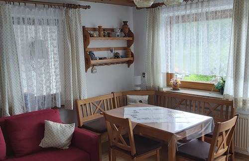 apartamento tranquilo en planta baja de unos 45 metros cuadrados con excelentes vistas del panorama de las montañas circundantes. En el apartamento hay un dormitorio, baño con bañera, el baño está separado del baño, en la sala de estar hay un dormitorio y una cocina separada. El apartamento tiene su propia entrada y una terraza con asientos y hermosas vistas, esto lo invita a relajarse.