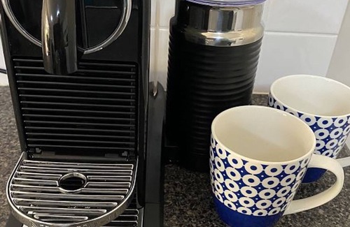 Una cocina bien equipada con nevera / congelador, horno, placa eléctrica, lavaplatos, hervidor, microondas, cafetera Nespresso y 2da nevera en el garaje.