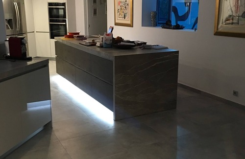 La cocina recién equipada presenta una isla central terminada en piedra natural local, con el área de cocción en un extremo y taburetes en el extremo opuesto para comidas informales o compañía para el chef. La cocina está equipada con electrodomésticos modernos, que incluyen dos hornos empotrados Neff (uno es una combinación de microondas / horno), placa de inducción, refrigerador / congelador de estilo americano con dispensador de agua fría y filtrada y hielo, lavaplatos, una nevera para vinos y abundante de armarios y cajones que contienen casi todos los utensilios y electrodomésticos que un cocinero podría desear