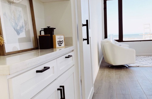 Cuando llegue a la elegante villa frente a la playa, ingresará a un área de concepto abierto con una cocina completa y una acogedora sala de estar con fantásticas vistas al mar.