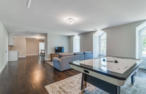 El segundo piso tiene una sala de entretenimiento con un sofá seccional extraíble, TV de pantalla plana de alta definición, un bar con zona de estar y una mesa de air hockey. El bar tiene un refrigerador, copas de vino, cafetera, tostadora y microondas. Hay un armario lleno de juegos de mesa. Hay 3 amplias habitaciones alfombradas en este piso; una habitación king, una habitación queen y dos camas individuales en la tercera habitación.