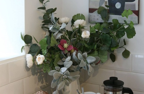 Cómodo sofá en un soleado salón orientado al sur con televisión inteligente, reproductor de DVD y Netflix. Hay un sillón acogedor y muchos libros sobre Brighton y su historia. También hay una mesa de comedor y sillas para las comidas que se pueden extender para los amigos.