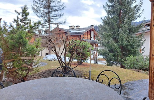 En el exterior, el patio privado ofrece un espacio ideal para relajarse, amueblado con mesa, sillas y tumbonas, rodeado de un entorno natural encantador. En invierno, el paisaje nevado que rodea el complejo residencial transforma este espacio en un lugar mágico, perfecto para disfrutar de la tranquilidad de los Alpes.