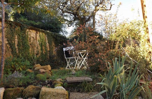 Esta cabaña de quinientos años de antigüedad fue completamente renovada en 2014, al tiempo que conserva muchas características originales, como vigas de techo a la vista, algunas paredes interiores de piedra, eviers (viejos fregaderos de cocina, ¡ahora no en uso!), dos bodegas con hornos de pan (no operacionales). Hay un pequeño jardín y una pequeña terraza que da al comedor principal. En la planta baja hay un gran comedor / cocina de planta abierta, con una unidad de isla que contiene dos refrigeradores debajo del mostrador. La encimera de gas y el horno eléctrico se encuentran en una antigua chimenea. Hay un lavavajillas en la cocina y una lavadora y congelador en una de las bodegas. La ventana de la cocina da a una vista del campo al norte de la ciudad. El campo al norte está a menos de 100 metros de la casa. Desde la cocina hay unos escalones que conducen a una sala de estar separada con dos cómodos sofás y una chimenea con estufa de leña. Desde el área de la cocina, las escaleras conducen al dormitorio principal a la izquierda, que tiene una cama doble y una ventana que da al jardín. El techo está en ángulo, por lo que el armario está en el rellano. El dormitorio principal y el baño tienen puertas correderas. El cuarto de baño tiene una ducha a ras de suelo, lavabo, espejo e inodoro, y una ventana Velux. Más allá de otro pequeño rellano, separado del resto del piso de arriba por una puerta, se encuentra el segundo dormitorio, que tiene una cama doble y una pequeña ventana que da al campo. El sistema de agua caliente es un cilindro eléctrico. Se proporcionan toda la vajilla, cubertería, cristalería, mantelería y pequeños electrodomésticos necesarios, como tetera, tostadora, licuadora. En invierno, la calefacción es provista por calentadores individuales programables de almacenamiento eléctrico en cada habitación. (Habrá un cargo adicional por esta instalación, si se usa).