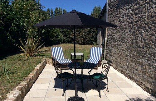Casa de piedra recientemente renovada en el terreno de una "maison de mâitre" con su propia terraza y jardín. La casa ha sido diseñada teniendo en cuenta el estilo y la comodidad. La luminosa sala de estar está en el primer piso y el sol de la tarde entra por el gran ventanal. Hay calefacción eléctrica, así como una estufa de leña para el invierno. El dormitorio en la planta baja tiene una cama king size y un amplio cuarto de baño al otro lado del pasillo.
