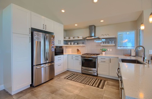 CASA COMPLETAMENTE REMODELADA ENERO 2019 ¡Ubicada directamente al otro lado de la calle de Shamel Park y la playa de arena, sin casas ni techos que obstruyan sus vistas! Esta casa tiene vistas panorámicas al océano desde casi todas las ventanas de la casa, enmarcada solo por la playa Moonstone y los cipreses de la costa del Pacífico. Este moderno y moderno santuario de playa ha sido completamente renovado con pisos de baldosas nuevas, una cocina nueva, baños nuevos, iluminación, pintura y más. La sala de estar de concepto abierto contemporáneo abarca una sensibilidad de retiro de playa brillante, aireada y relajante. Las comodidades exclusivas y las opciones de diseño te hacen sentir como en casa, al tiempo que aprecias la atención a los detalles y la simplicidad brillante a la vez. Casi todos nuestros huéspedes son huéspedes frecuentes, quienes nos dicen que Cambria Park Shores es su hogar favorito en Cambria. Bebe en las espectaculares puestas de sol desde cada habitación; contempla a los delfines desde la comodidad de la gran sala y sumérgete en la serenidad de estar tranquilo por el sonido de las olas. Disfrute de la conexión inalámbrica a Internet de alta velocidad, una hermosa chimenea a gas, cuatro televisores de pantalla plana (2 inteligentes), garaje para 2 autos, lavadora y secadora, parrilla de carbón, microondas, lavaplatos y ventilador de techo en la gran sala. Una envoltura angosta alrededor de la cubierta frente a la casa es ideal para tostar puestas de sol sobre el agua, o contemplar los fuegos artificiales del 4 de julio en el parque al otro lado de la calle. También hay una acogedora terraza para sentarse al lado del dormitorio principal con hermosas vistas al océano. Camine por la calle desde la casa hasta la playa y el parque Shamel. El parque cuenta con un área de césped animado con mesas de picnic, barbacoas, estructura de juegos y piscina. Camine a pocas cuadras de la pintoresca colonia de artistas del centro de Cambria, con sus abundantes restaurantes, atractivas boutiques, galerías de arte y vino. TOT # 0000529