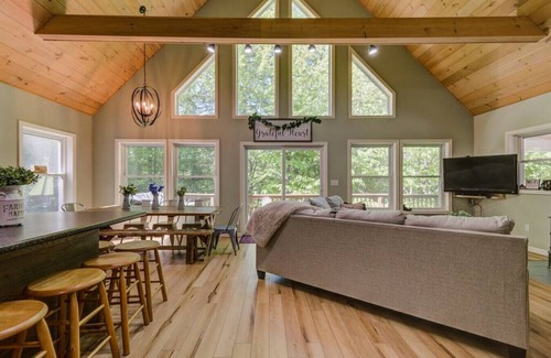 Desde el momento en que entras por la puerta, apreciarás todos los toques especiales que tiene esta casa. La cubierta envolvente ofrece asientos generosos, y desde la cocina completa puede acceder fácilmente a la parrilla al aire libre para preparar comidas. Cene al aire libre y disfrute de los tranquilos sonidos de la naturaleza en las montañas. Detrás de la casa hay un pozo de fuego donde puedes disfrutar de S'mores y las historias de fogatas.