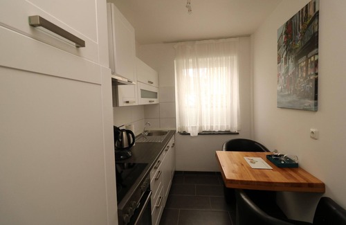 Este apartamento, bien equipado y ubicado en una segunda planta, en el distrito Frohnhausen de Essen, es ideal para 3 personas que buscan comodidad y practicidad. La distribución incluye una sala de estar/dormitorio con dos camas individuales, TV y zona de estar, además de un segundo dormitorio con dos camas individuales más. El baño cuenta con ducha, lavabo e inodoro, mientras que la cocina americana está equipada con cafetera y hervidor eléctrico para preparar comidas ligeras. Los huéspedes pueden relajarse en el balcón, disfrutar de comidas en la terraza con muebles de jardín o relajarse en el sofá cama. Las comodidades adicionales incluyen secadora, lavadora de pago y aparcamiento. Tiendas y restaurantes están a solo 200 m, y el centro de la ciudad y la estación de tren de Essen HBF están a solo 3 km. El recinto ferial de Essen está a solo 5 km en coche, con fácil acceso a los aeropuertos de Düsseldorf (40 km) y Dortmund (50 km). Este apartamento combina la tranquilidad de una vida urbana con la accesibilidad.