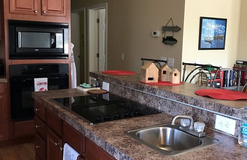 microondas, ollas / sartenes, utensilios, estufa / refrigerador / congelador / máquina de hielo. Lavadora / secadora también. Cafetera y cafetera Keriug. Ropa de cama / toallas de baño, jabón, detergente, champú / acondicionador y gel de ducha. Hemos agregado un paquete n play este año