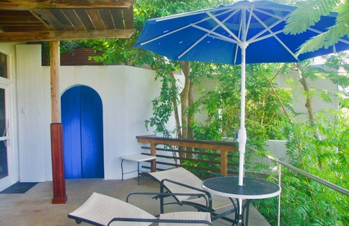 Una bahía única, privada de aparcamiento (exclusivo para los huéspedes de los apartamentos) se encuentra por debajo de una escalera de mampostería ascendente que pasa una gran cascada curiosamente esculpido / pileta rodeada de exuberante follaje tropical. Desde finales escalera, se procede a lo largo de una pasarela a la sombra hacia un stand de bambú y apartamentos cubierta. La cubierta se enfrenta a las puestas de sol y agua, con vistas a la vegetación del jardín. Mantenga el alimentador suministrado con el azúcar y dejar que los bananquits y pinzones que entretienen. Levantarse temprano y probablemente verá ciervos o un burro ocasionales comer ese mismo jardín.