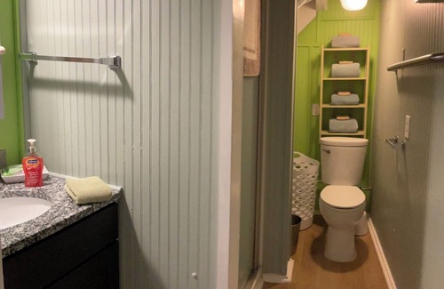 La cabaña se encuentra en nuestro jardín y está cerca de muchas atracciones del área. El primer piso tiene un baño completo (solo ducha) situado en una esquina. El resto del primer piso es una sala de estar, una cocina totalmente equipada con una cama queen size en un extremo que tiene una división de cortina.