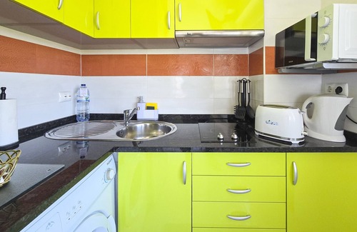 La kitchenette, con placa vitrocerámica, incluye frigorífico, microondas, horno, congelador, vajilla, utensilios de cocina y cafetera — todo lo que necesita para comidas prácticas y deliciosas.