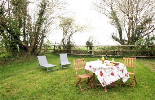 El estudio está equipado con una pequeña cocina, un baño con bañera y WC y una terraza con vistas al campo.