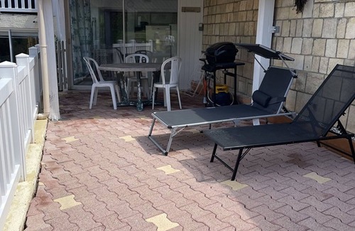 Terraza cubierta con muebles de jardín, tumbonas y barbacoa.