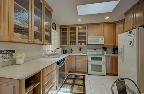 La cocina cuenta con todos los electrodomésticos nuevos: refrigerador grande con hielo y agua en la puerta, estufa / horno, lavaplatos y microondas. Fue renovado con hermosos gabinetes y encimeras. Viene totalmente equipado con: cubiertos, vasos y platos para 8 configuraciones junto con ollas, sartenes, cafetera, tostadora y licuadora.