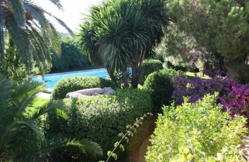 En la zona exterior usted podrá disfrutar de una piscina maravillosa y de grandes dimensiones rodeada de jardines y una extensa zona de césped para tomar el sol comodamente y jugar tranquilamente con la familia, de la barbacoa exterior, de un paseo por los jardines con el estanque de nenúfares y el cenador e incluso visitar el huerto de árboles frutales y los animales de granja que ocupan las dependencias situadas al fondo de la finca.
