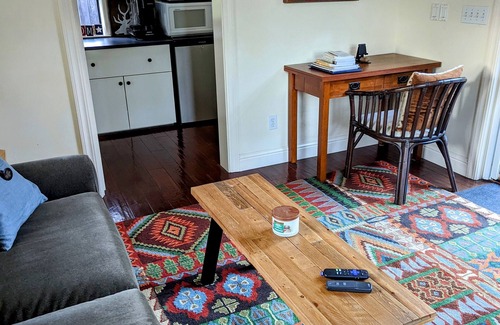 El primer piso tiene un dormitorio con una cama queen size y un armario, baño completo con ducha, sala de estar con chimenea de gas y cocina completa con barra de descanso. La cocina cuenta con refrigerador de tamaño completo, fregadero con triturador de basura, microondas, estufa de 4 hornillas, horno tostador, vajilla, utensilios y utensilios de cocina. El primer piso se abre a un hermoso patio privado de pizarra con mesa de comedor, sillas y barbacoa. El gran loft del segundo piso tiene un escritorio, un sofá cama y TV.
